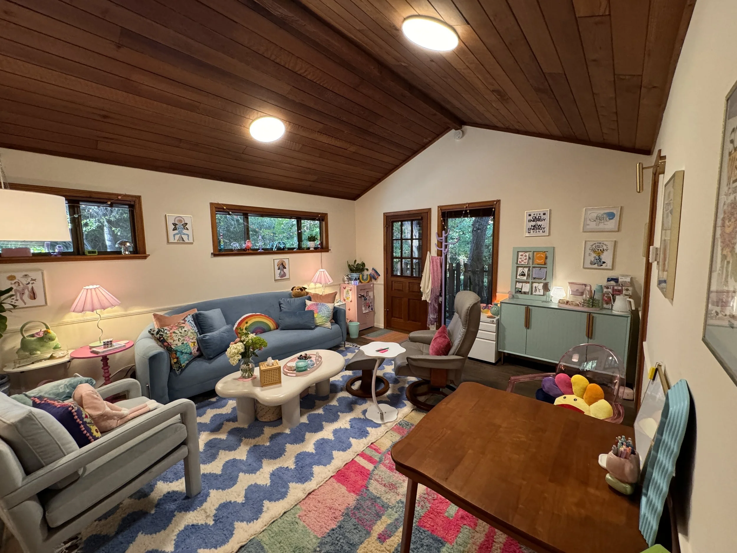 At Thea Integrative Therapy in Lafayette, CA, in-person sessions take place in a space designed to nurture creativity, comfort, and connection. The office feels bright, inviting, and playfully styled — a cozy reflection of “dopamine decor,” where color, texture, and art come together to spark joy and inspiration, and a step away from the typical neutral, clinical therapy office. From the soft blue velvet couch to the rainbow accents and handpicked art, every detail is curated to help you feel grounded, inspired, and safe to express yourself fully.